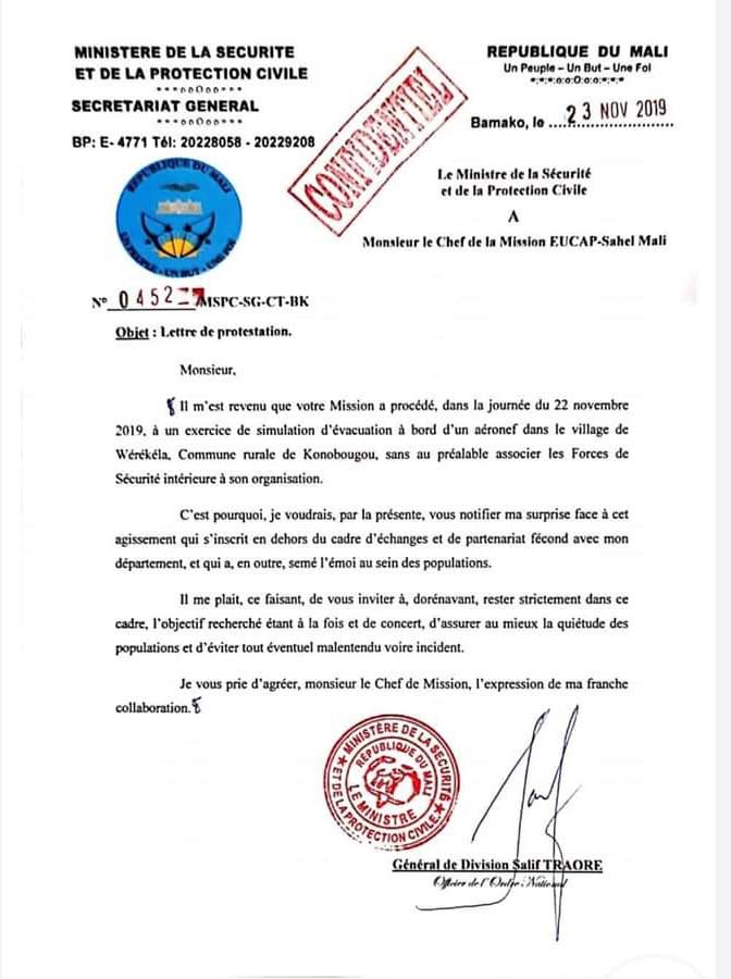 Nous annoncions hier, les manœuvres suspectes signalées par les populations à Fana. Il s’agissait pas des opérations de Barkhane mais d’Eucap Sahel, une autre force européenne dite formation au Mali. Dans une lettre « confidentielle » le ministère de la Sécurité confirme notre information et proteste contre ses agissements qui créent des inquiétudes chez les populations.