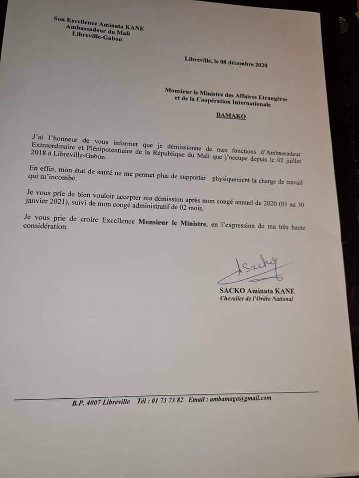 La diplomate malienne évoque des raisons de santé. «Mon état de santé ne me permet plus de supporter physiquement les charges du travail qui m’incombe. Je vous prie de bien vouloir accepter ma démission après mon congé annuel du 01 au 30 janvier 2021, suivi de mon congé administratif de 2 mois », indique Ami Kané dans sa lettre de démission. Réputée comme une modèle par de nombreuses femmes, Ami Kane a passé toute sa carrière à servir la police malienne, où elle a conduit avec brio de nombreuses enquêtes qui ont permis de mettre hors d’état de nuire plusieurs criminels.