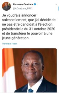 « Je voudrais annoncer solennellement, que j’ai décidé de ne pas être candidat à l’élection présidentielle du 31 octobre 2020 et de transférer le pouvoir à une jeune génération. »