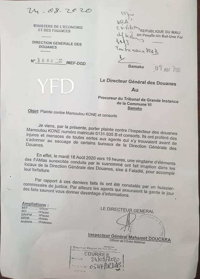 Le DG des Douanes Mahamet Doucara porte plainte contre Mamoutou Koné et consorts qui ont profité des évènements du 18 août 2020 pour aller saccager à visage découvert les bureaux de la Direction Générale des Douanes.