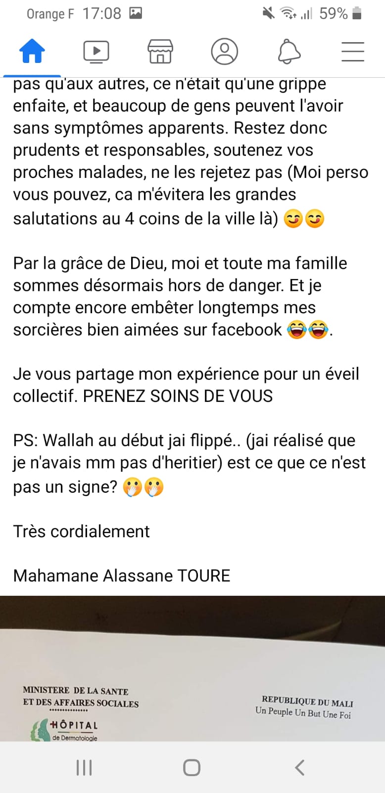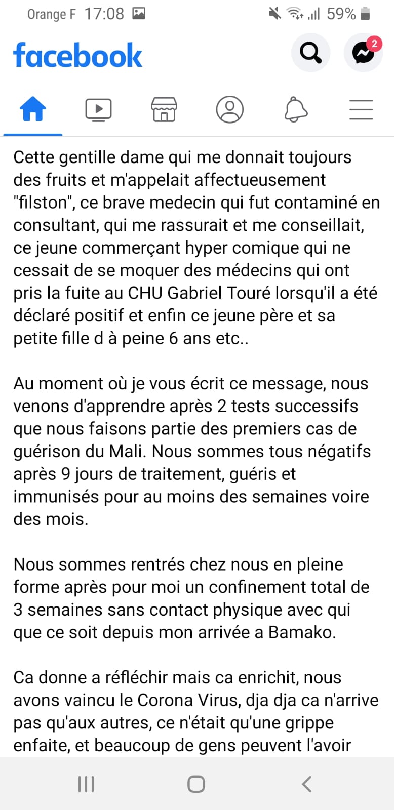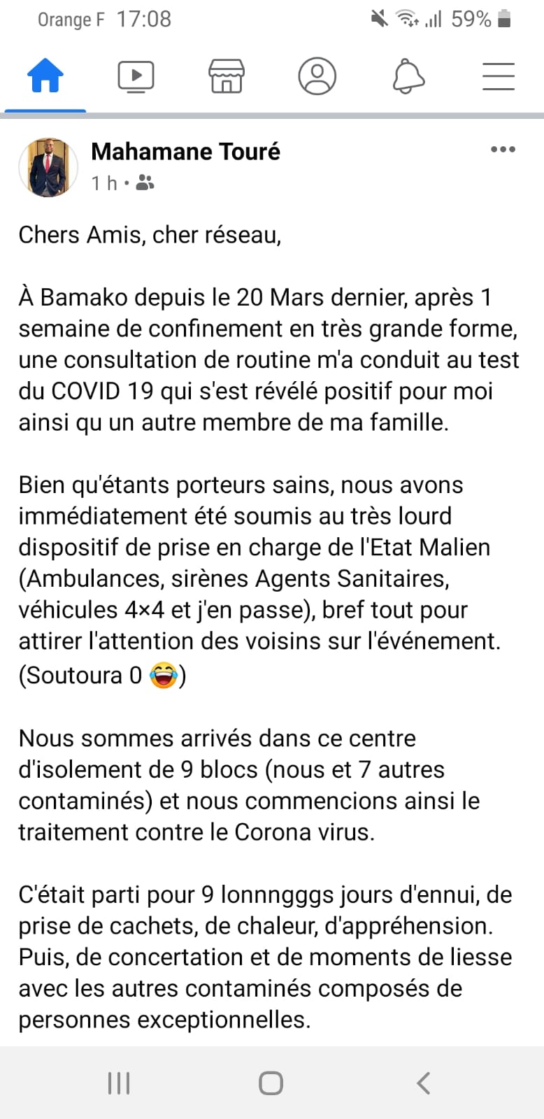 A LA UNE Covid19 au Mali: Un patient guéri donne le traitement dans son témoignage By La redaction On Avr 7, 2020 0 Share Partager :Cliquer pour imprimer(ouvre dans une nouvelle fenêtre)Continue Reading 0 Share FacebookTwitterGoogle+ReddItWhatsAppPinterestCourriel