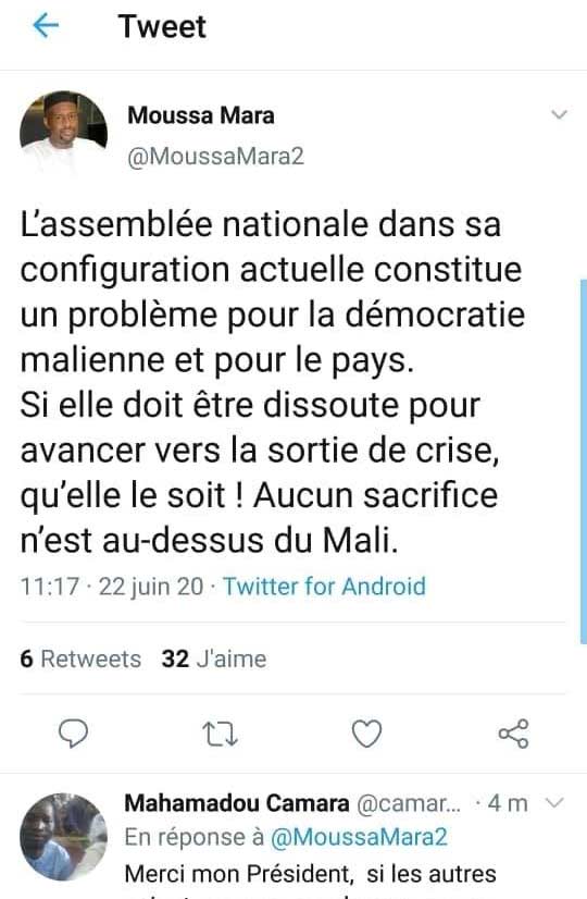 Député élu en commune du district de Bamako, l’ancien Premier ministre Moussa Mara, se dit favorable à la dissolution de l’Assemblée nationale du Mali. Rappelons que Moussa Mara était l’adversaire de Moussa Timbiné pour le perchoir.
