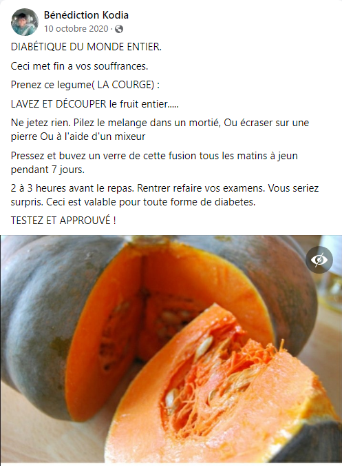La publication devenue virale propose une méthode pour le traitement du diabète. Accompagné d’une image de la courge, le post précise : « Diabétiques du monde entier, ceci met fin à vos souffrances. Prenez ce légume (la courge) : Lavez et découpez le fruit entier. Ne jetez rien. Pilez le mélange dans un mortier, ou écrasez sur une pierre ou à l’aide d’un mixeur. Pressez et buvez un verre de cette fusion tous les matins à jeun pendant 7 jours, 2 à 3 heures avant le repas. Rentrer refaire vos examens. Vous seriez surpris. Ceci est valable pour toute forme de diabètes. Testé et approuvé ».