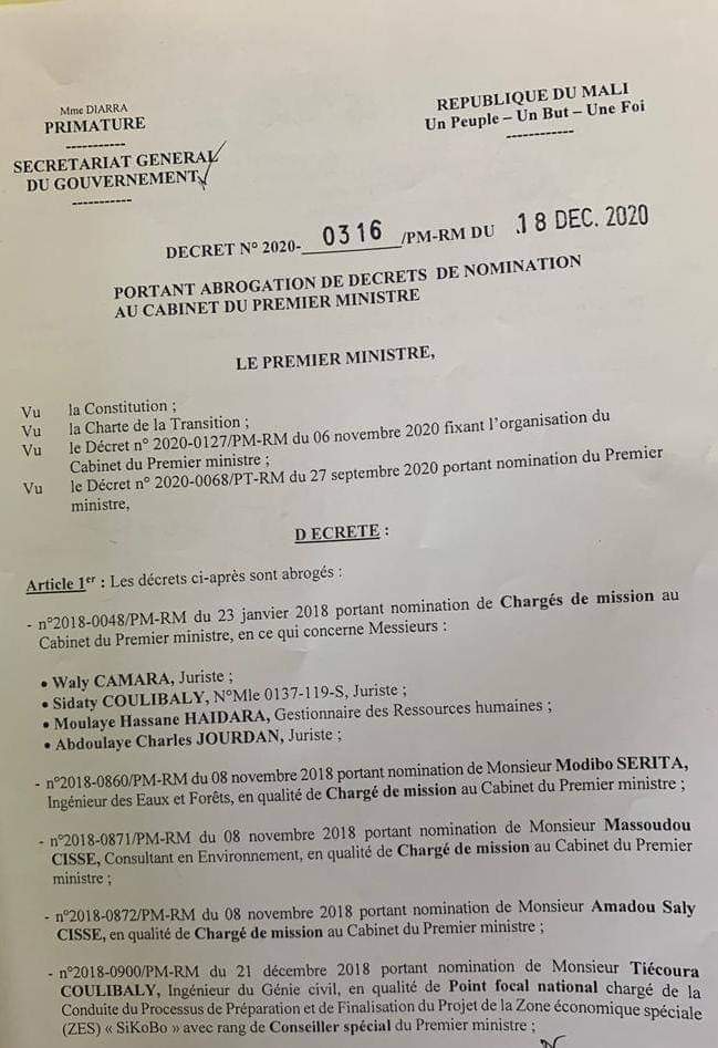 La primature a abrogés les décrets de nominations de 13 personnes en son sein le 18 Décembre 2020. 12 chargés de missions et un conseiller technique qui était chargé de la communication de la primature.
