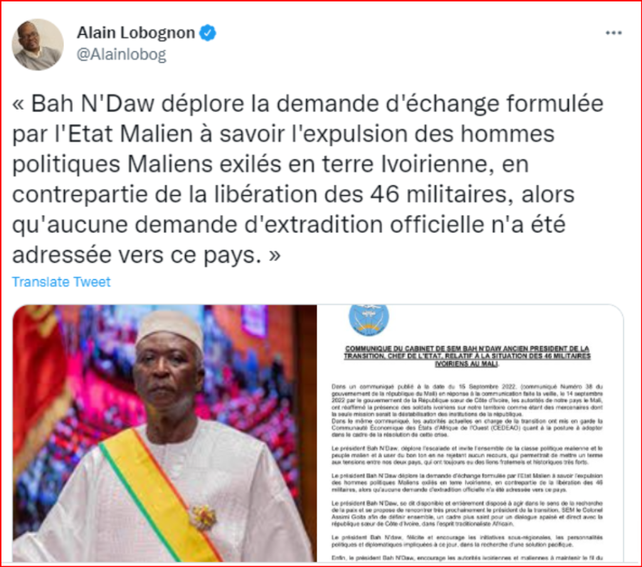 La publication sur Twitter a été faite par Alain Lobognon, le 17 septembre 2022, deux jours après le communiqué de la présidence du Mali, en réponse à un communiqué du Gouvernement ivoirien, relatif aux 49 soldats arrêtés à Bamako le 10 juillet 2022.