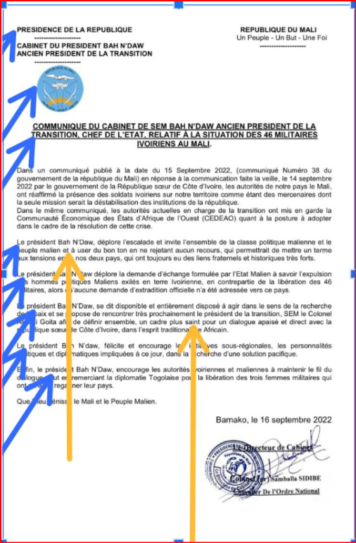 Dans un mail échangé avec DjéliCheck, le service de communication de la Présidence du Mali a aussi démenti le message. « Ce document est un fake. Le cabinet de l’ex président de la transition Bah N’daw, ne peut utiliser l’emblème du Mali », a affirmé le service de communication de la présidence de la République du Mali.