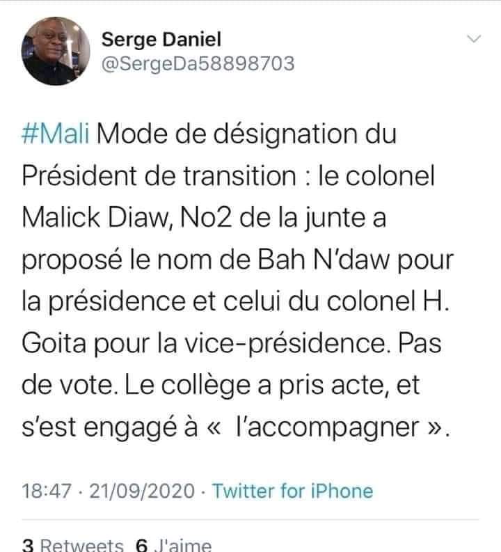 Sur le NetPetite Une Les membres du collège qui ont proposé le Président et le Vice Président. By La redaction Last updated Sep 21, 2020 0 Share En image les membres du collège qui ont proposé le Président ( Bah N’Daw) et le Vice Président ( col Assimi Goita). Partager :Cliquer pour imprimer(ouvre dans une nouvelle fenêtre)Continue Reading 0 Share FacebookTwitterGoogle+ReddItWhatsAppPinterestCourriel