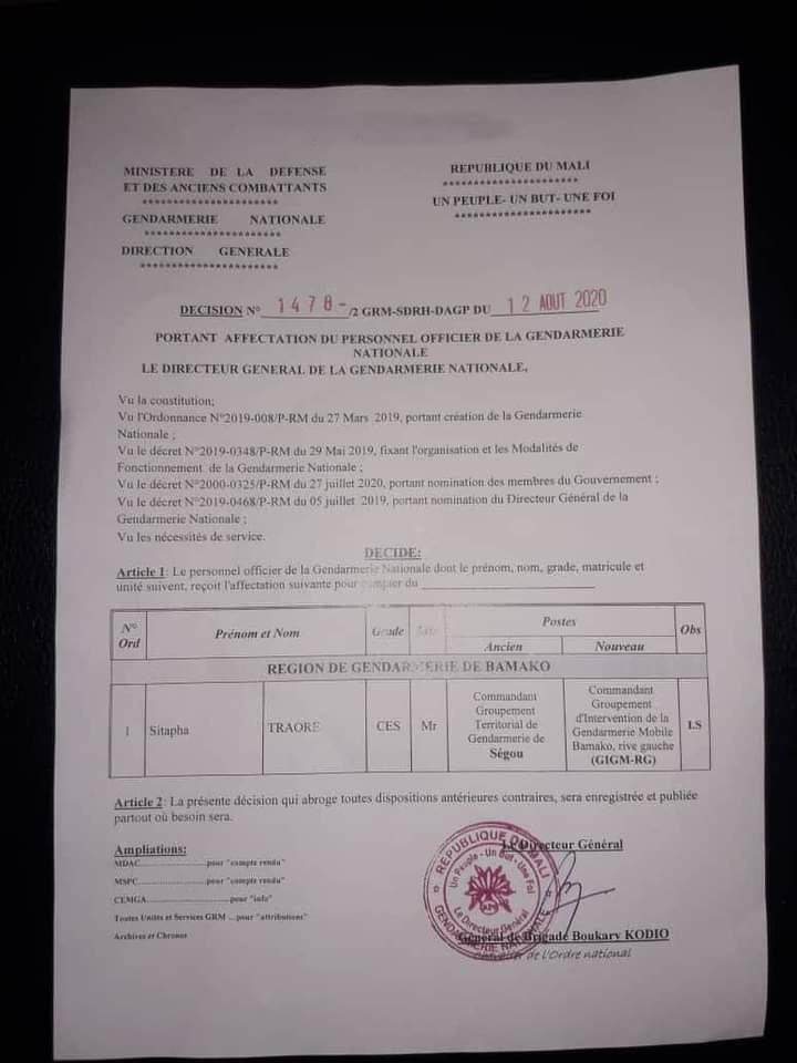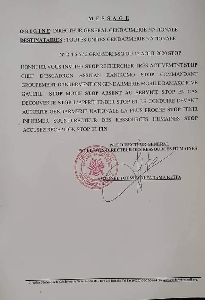 Des sources confidentielles nous confirment que le commandant Alpha Yaya Sangaré et son père l’inspecteur général à la retraite Yaya Sangaré ont été signalés ce mercredi au domicile du prêcheur chérif Ousmane Haidara vers 1H45 du matin.Une décision a été prise ce jour pour relever Astan Kanikomo de son poste, elle sera remplacée par Sitapha Traoré.