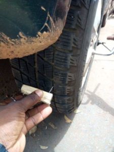 Aujourd’hui, j’ai échappé belle à un coup de ce réseau de voleurs au centre-ville de Bamako, près Mali MAG. J’avais stationné mon véhicule dans ce parking, après des courses au marché, je suis venu prendre mon véhicule, du coup, j’ai senti un bruit inhabituel (voir photo) dans le pneu arrière droite. Quand j’ai voulu stationner, c’est deux jeunes non loin qui m’observaient. J’ai compris le piège, là je me suis débrouillé pour aller chez le vulcanisateur le plus proche. Arrivez là, sans dire quoi que ce soit, le monsieur me demanda :