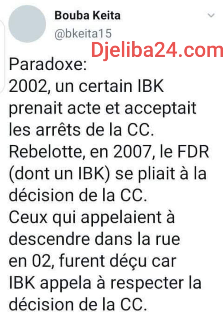 Dans un tweet Bouba Keita, le second fils du président IBK semble justifier les actes de la Cour de la constitutionnelle. Ke fiston national bis oublie que ce qui était toléré hier ne l’est plus aujourd’hui. La démocratie malienne mûrie, les démocrates aussi.