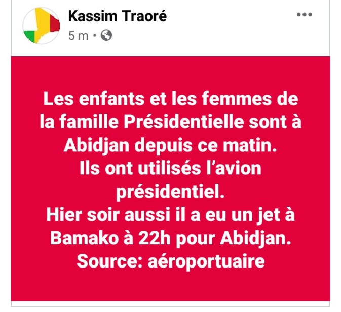 Des membres de la famille présidentielle ont quitté Bamako pour Abidjan. L’information qui circulait sur les réseaux sociaux a été confirmée par une source à l’aéroport Bamako Senou.