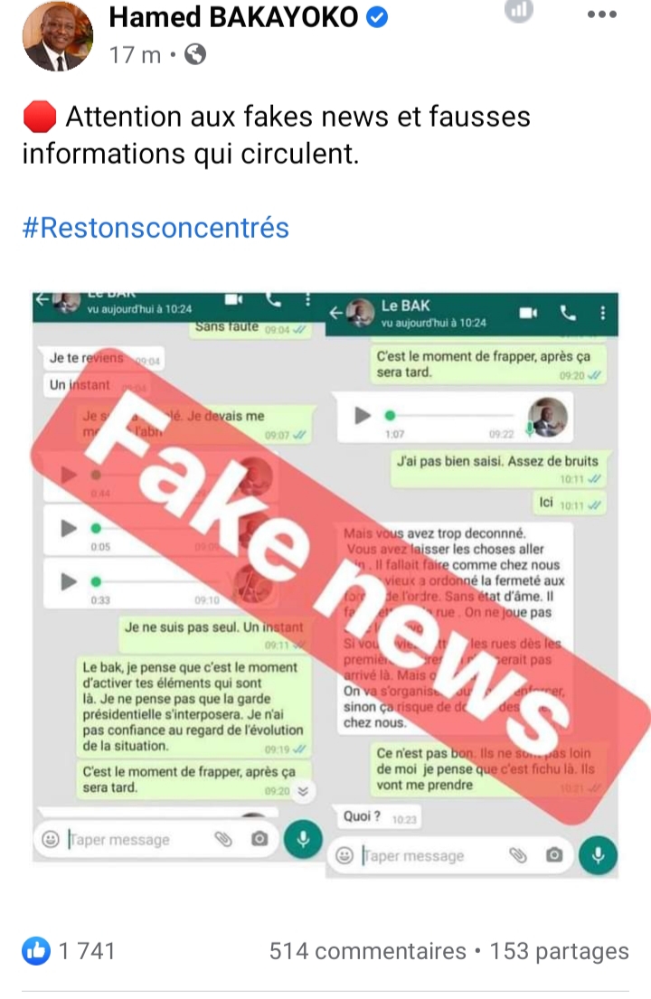 Accusé d’avoir une une conversation WhatsApp avec Karim Keita, pour envoyer des renforts contre les militaires, le premier ministre ivoirien dément cette information.