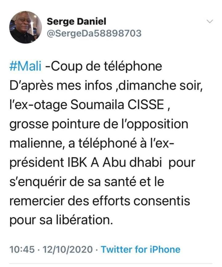 Sur le NetPetite Une Mali: Le coup de fil de Soumaila Cissé à IBK By La redaction On Oct 12, 2020 0 Share Le journal Serge Daniel a donné l’information. SOUMAÏLA CISSÉ a téléphoné à IBK pour le remercier de sa libération. Partager :Cliquer pour imprimer(ouvre dans une nouvelle fenêtre)Continue Reading 0 Share FacebookTwitterGoogle+ReddItWhatsAppPinterestCourriel