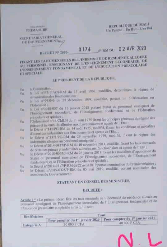 A LA UNE Mali: Le président IBK accorde des avantages aux enseignants (décret) By La redaction On Avr 3, 2020 0 Share Partager :Cliquer pour imprimer(ouvre dans une nouvelle fenêtre)Continue Reading 0 Share FacebookTwitterGoogle+ReddItWhatsAppPinterestCourriel
