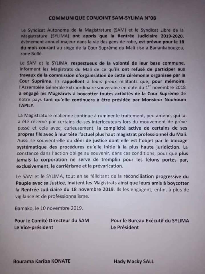 Les syndicats des Magistrats SAM et SYLIMA s’attaquent au Président de la cour suprême et boycottent la rentrée judiciaire tant que Nouhoum Tapily n’est pas limogé.Les deux syndicats n’ont toujours pas digéré l’opposition du Président de la cour suprême pendant leur bras de fer contre le pouvoir exécutif.