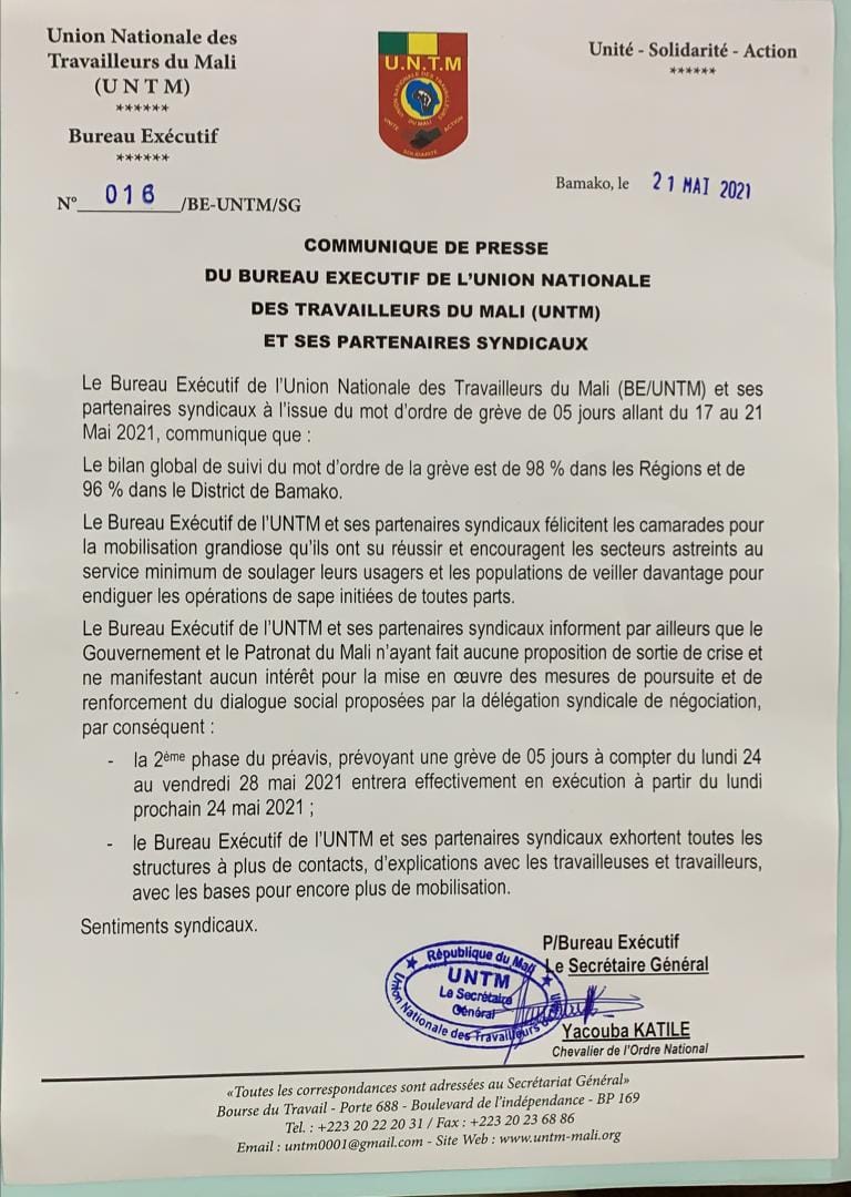 En raison de la satisfaction par le Gouvernement du Mali après les cinq (05) jours précédents de grève qui furent du 17 au 21 Mai 2021, le Bureau Exécutif de l’Union Nationale des Travailleurs du Mali (BE/UNTM) et ses partenaires syndicaux prévoient ce 21 Mai 2021 une autre grève qui entrera en vigueur et s’étendra plus précisément du Lundi 24 au vendredi 28 Mai 2021.