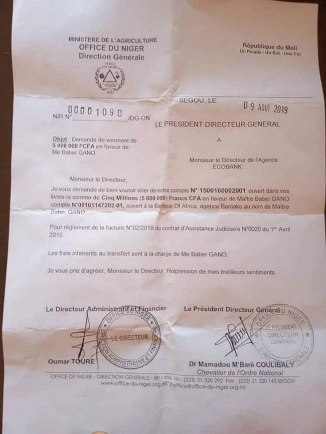 Sur la table du Pôle Économique se trouve, depuis le 21 Mai 2019 une plainte de l’Autorité de Régulation des Marchés Publics et des Délégations de Service Public (ARMDS, pour détournement de deniers publics, contre Me Baber Gano, Ministre du gouvernement et le PDG de l’Office du Niger, Mamadou M’baré Coulibaly, portant sur un montant de 401 millions de F CFA. Et le Syndicat Autonome de l’Office du Niger (SAON) est partie civile.