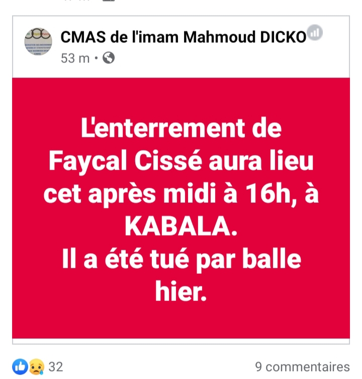 Sur le Net Mali: Mort dans les manifestations d’hier, Fayçal Cissé sera enterré ce soir By La redaction On Juil 11, 2020 0 Share LE PREMIER MARTYR DES ÉVÉNEMENTS D’HIER S’APPELLE FAYÇAL CISSÉ. QUE SON ÂME REPOSE EN PAIX Partager :Cliquer pour imprimer(ouvre dans une nouvelle fenêtre)Continue Reading 0 Share FacebookTwitterGoogle+ReddItWhatsAppPinterestCourriel