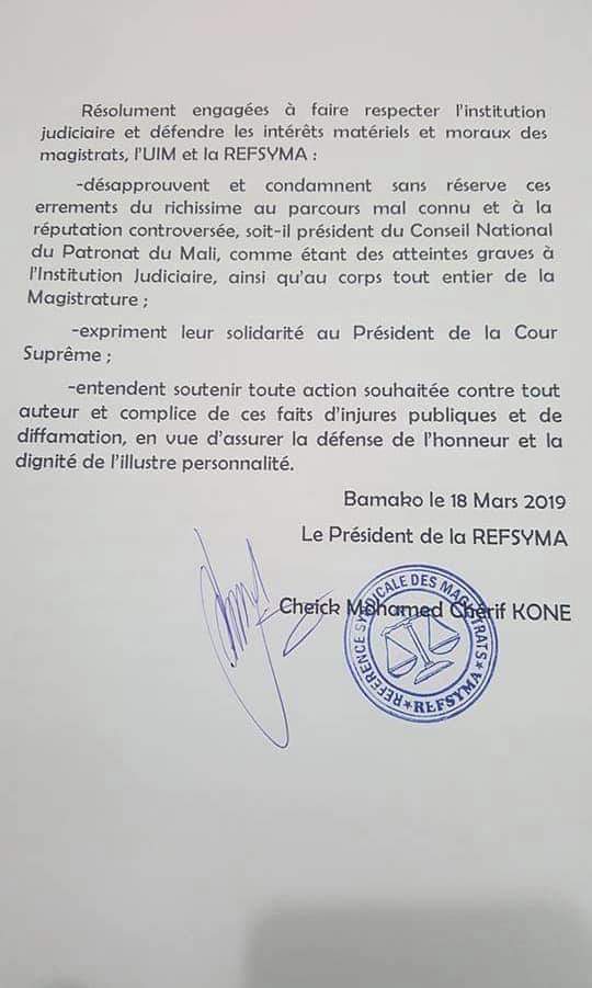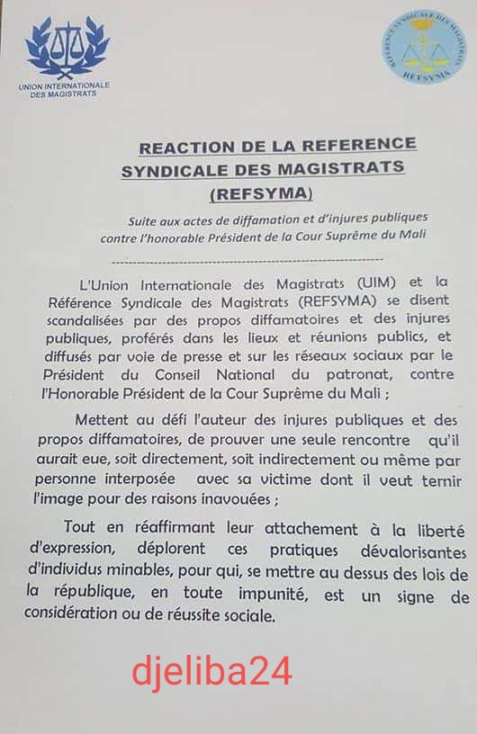 Les magistrats, ceux du nouveau syndicat créé par le dissident Cherif Koné, réagissent aux propos de Mamadou sinsy Coulibaly, président du patronat du Mali sur le président de la Cour Suprême. Lisez le communiqué….