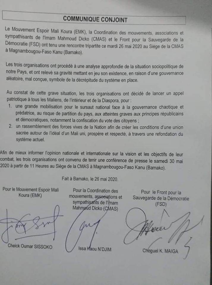 Le désormais front élargi projette une conférence de presse commune le samedi 30 mai 2020 au siège de la CMAS à 11 heures à Magnambougou Faso Kanu.