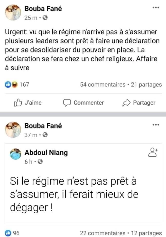 Sortis de prisons depuis quelques pour outrages à magistrats, les activistes Bouba Fané et Abdoul Niang reprennent leur sport favori sur les réseaux sociaux : appel à la violence et à la haine. Ils appellent le président IBK à s’assumer face aux manifestants.
