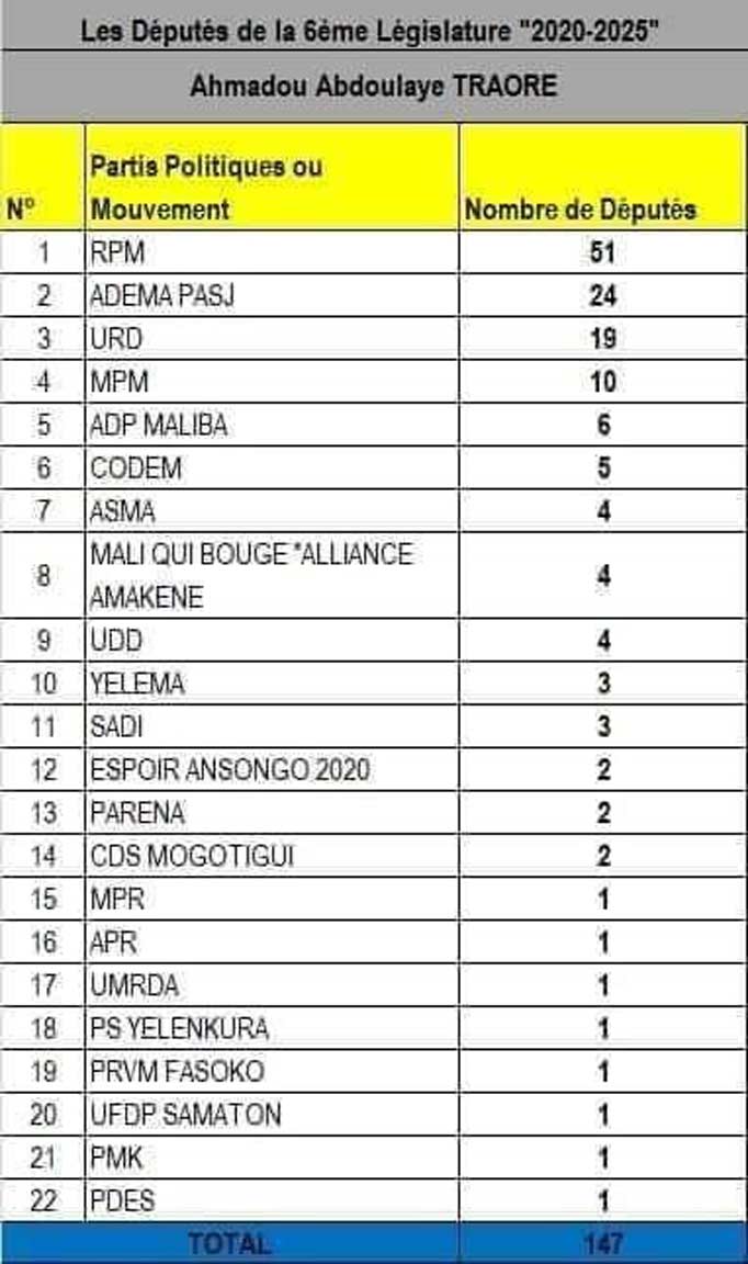 ADP Maliba obtient 6 députés à l’Assemblée nationale.