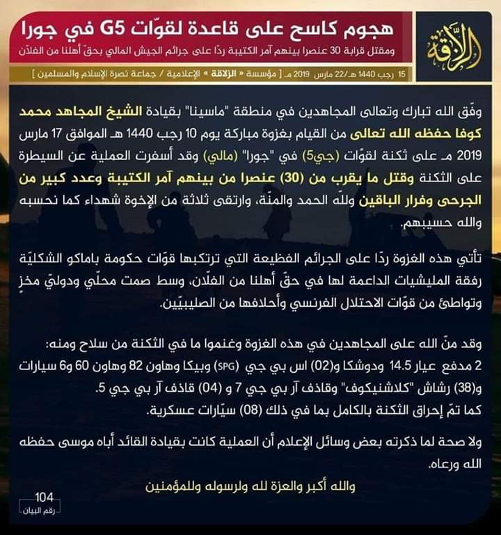 dans ce communiqué le JNIM affirme que l’attaque sur Dioura était dirigée par Amadou Koufa en personne ,le JNIM dément par la même occasion toute implication de Ba Moussa dans cette opération.