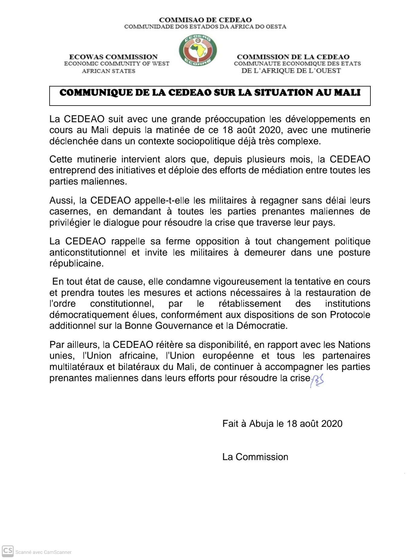 A LA UNE Mali [URGENT]: Communiqué de la CEDEAO sur les mutineries By La redaction On Août 18, 2020 0 Share Partager :Cliquer pour imprimer(ouvre dans une nouvelle fenêtre)Continue Reading 0 Share FacebookTwitterGoogle+ReddItWhatsAppPinterestCourriel