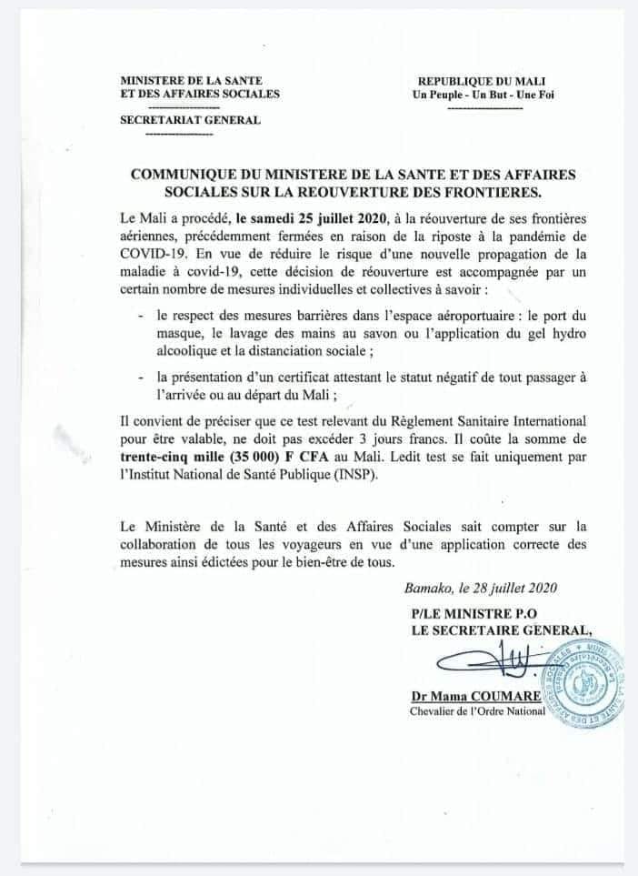 Le test COVID-19 facturé à 35.000 francs à tous les voyageurs passant par l’aéroport du Mali, adultes et enfants. Quel prix ! Imaginez un parent de deux, trois, quatre ou plus d’enfants. C’est une manne excessive à débourser alors que justement, c’est la COVID 19 qui a appauvri les ménages. C’est une pire gabegie !