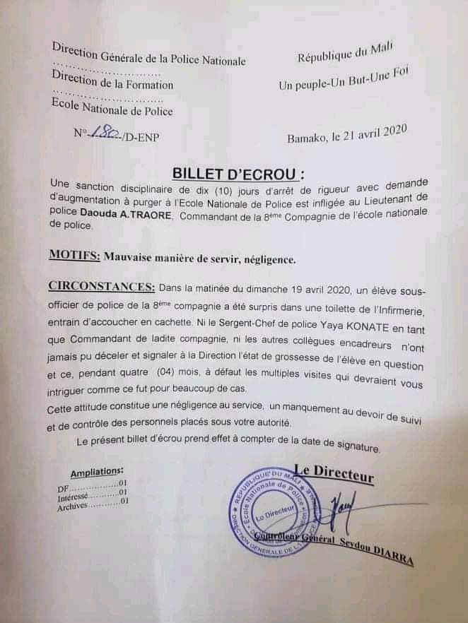 C’est après l’éclatement de cette affaire que la direction de l’école de Police vient d’infliger un arrêt de rigueur de 10 jours au Lieutenant Daouda A Traoré, commandant de la 8ème Compagnie et son complice serait le sergent chef Yaya Konate.