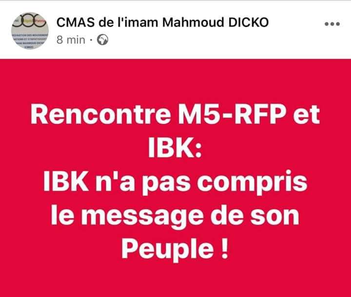 La rencontre entre IBK et le M5- RFP est terminé. Mais aucune solution n’a été trouvée. Au sortie de la rencontre les communicants du mouvement de l’imam Dicko écrivent: